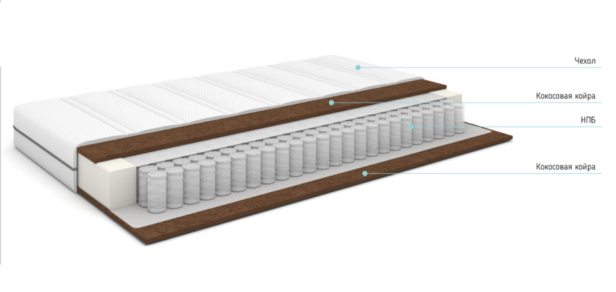Высота матраса -18 см (чехол 1 см + койра 1 см + НПБ 14 см+ койра 1 см+ чехол 1 см)