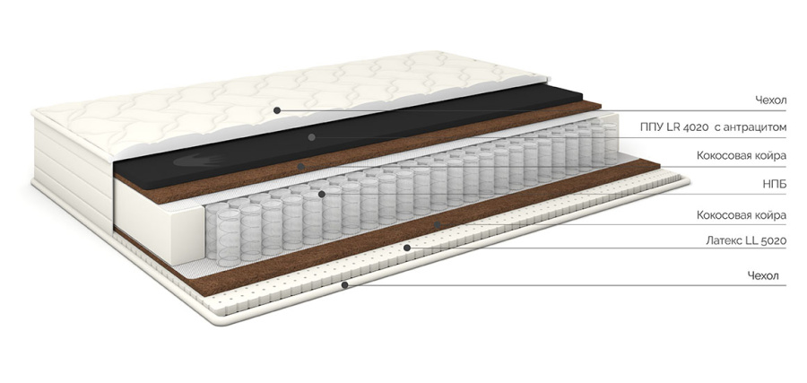 Высота матраса 24 см (чехол 2 см + ППУ (LR 4020) антрацит 2см+койра 1см + НПБ(520 шт./м²) 14см + койра 1см + латекс 2см + чехол 2 см)