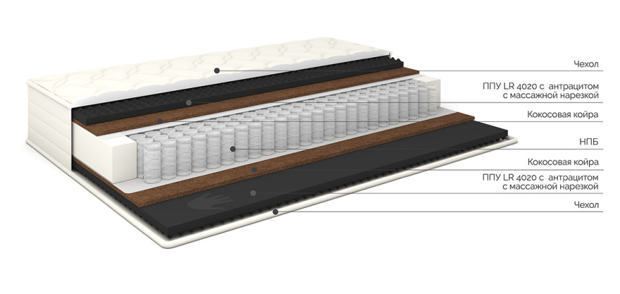 Высота матраса 28 см (чехол 2 см + ППУ (LR 4020) антрацит 4 см + койра1см + НПБ (520 шт./м²) 14см + койра 1см+ ППУ (LR 4020)
